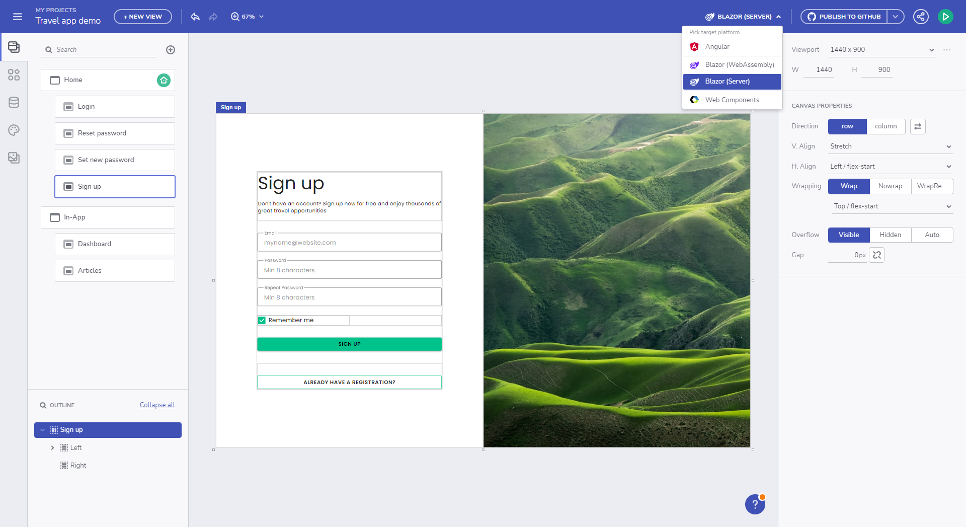 プラットフォーム ピッカー ドロップダウンは、[GitHub に公開] と [プレビュー] アクションボタンの隣のナビゲーション バーにあります。[Blazor Server/Blazor Web Assembly] オプションを選択して Blazor のコードを生成するか、[Angular] で生成したアプリとコードのプレビューを表示します。Web Components オプションも利用できます。