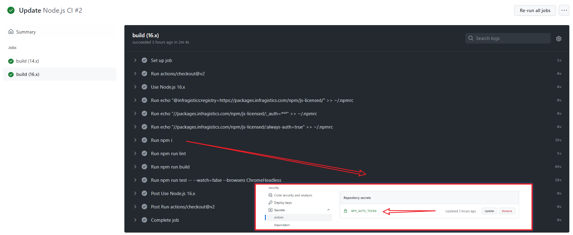 アプリケーションを GitHub に公開する際、プロジェクトのビルドと、基本テストを実行する CI を追加します。ライセンス版パッケージを使用するために GitHub CI から必要な NPM_AUTH_TOKEN も公開します。