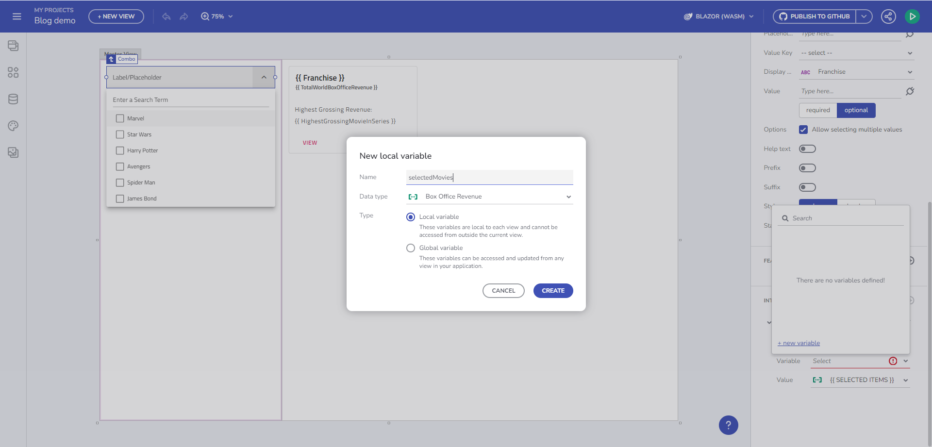 配列変数を作成する: 「Box Office Revenue」 型の空の配列変数を作成します。データ タイプは、Combo コンポーネントのデータ ソースに基づいて自動的に決定されます。