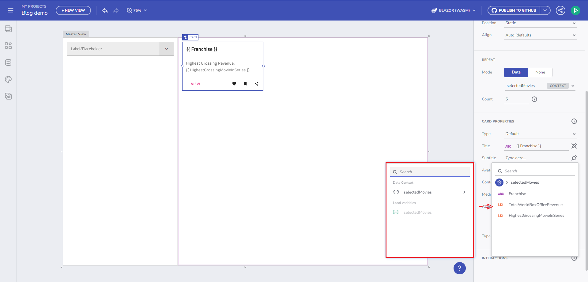 Card コンポーネントにバインドする: 「selectedMovies」 変数をカード コンポーネントにリンクします。Title プロパティと Subtitle プロパティをデータ コンテキストの適切なデータ フィールドにバインドします。