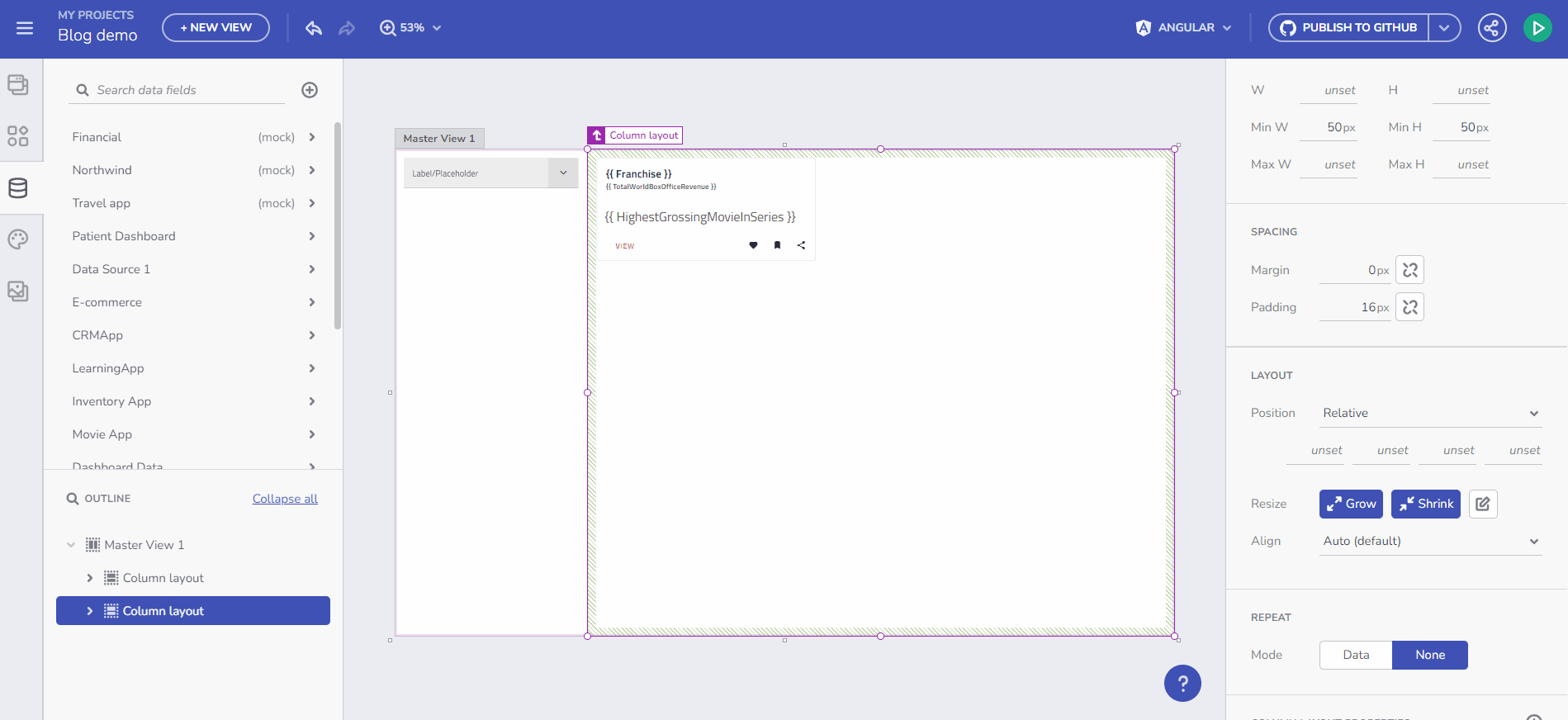 - 実用化: 映画コレクションをカード コンポーネントにバインドするプロセスは、データ バインドに変数を使用することの実用性と容易さを示しています。
