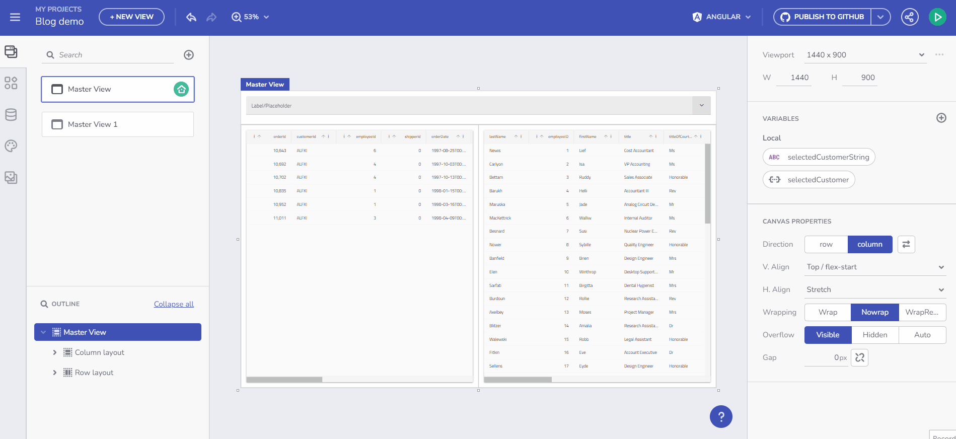 App Builder の Grid コンポーネントと Combo コンポーネントでは、選択モードの設定が可能です。興味深いことに、選択した選択モードに基づいて、変数の型が動的に変化します。例えば、シングル選択モードで顧客の配列にバインドされた Combo コンポーネントは、選択したアイテムのイベント コンテキストを通じて Customer オブジェクトを渡します。