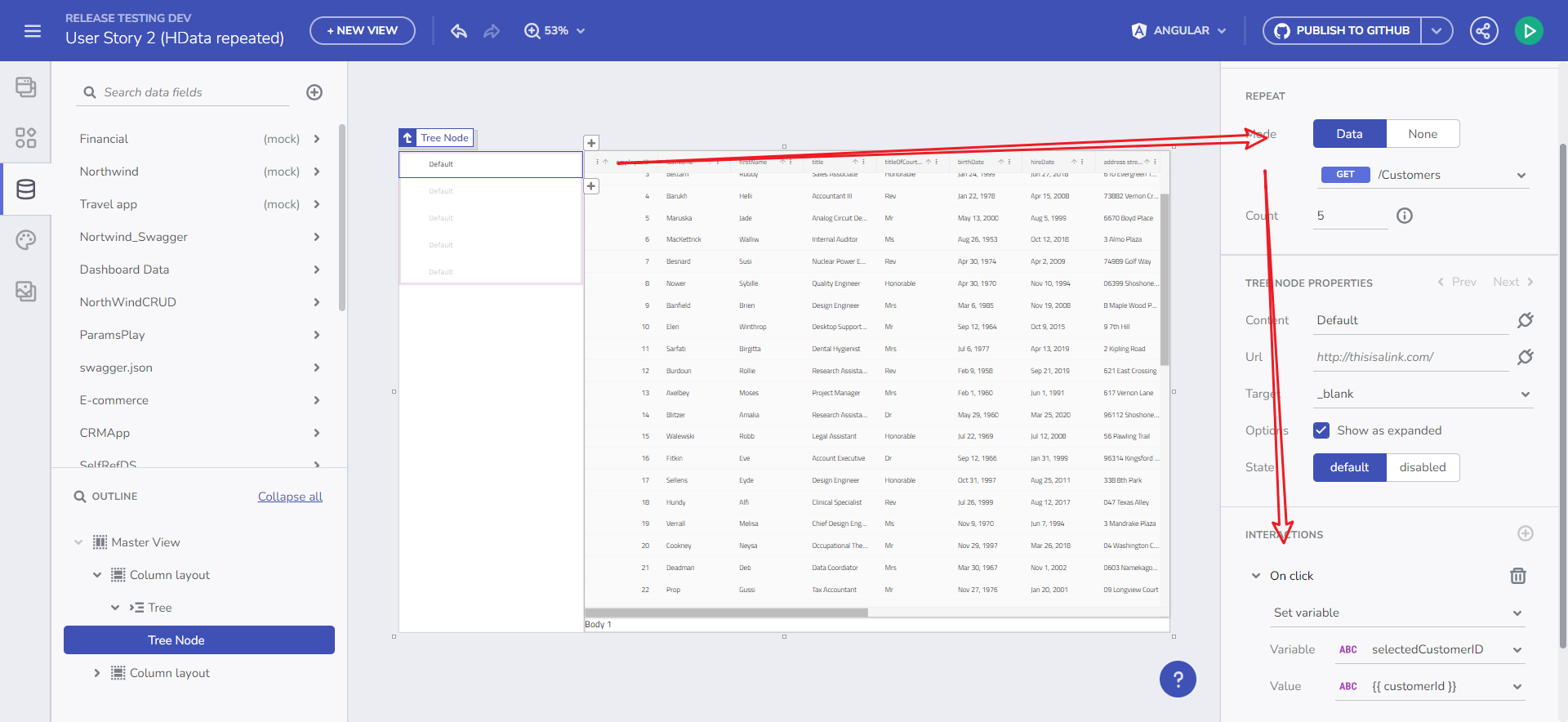 App Builder のすべてのコンポーネントには OnClick イベント ハンドラーが搭載されており、変数のコンテキストで利用できます。繰り返しデータを含むシナリオでは、OnClick -> 変数設定 のアクションを通じて特定のアイテムのデータ コンテキストにアクセスできます。この機能により、ツリー コンポーネントの例で示されているように、ユーザー インタラクションに基づいた変数値を修正できます。