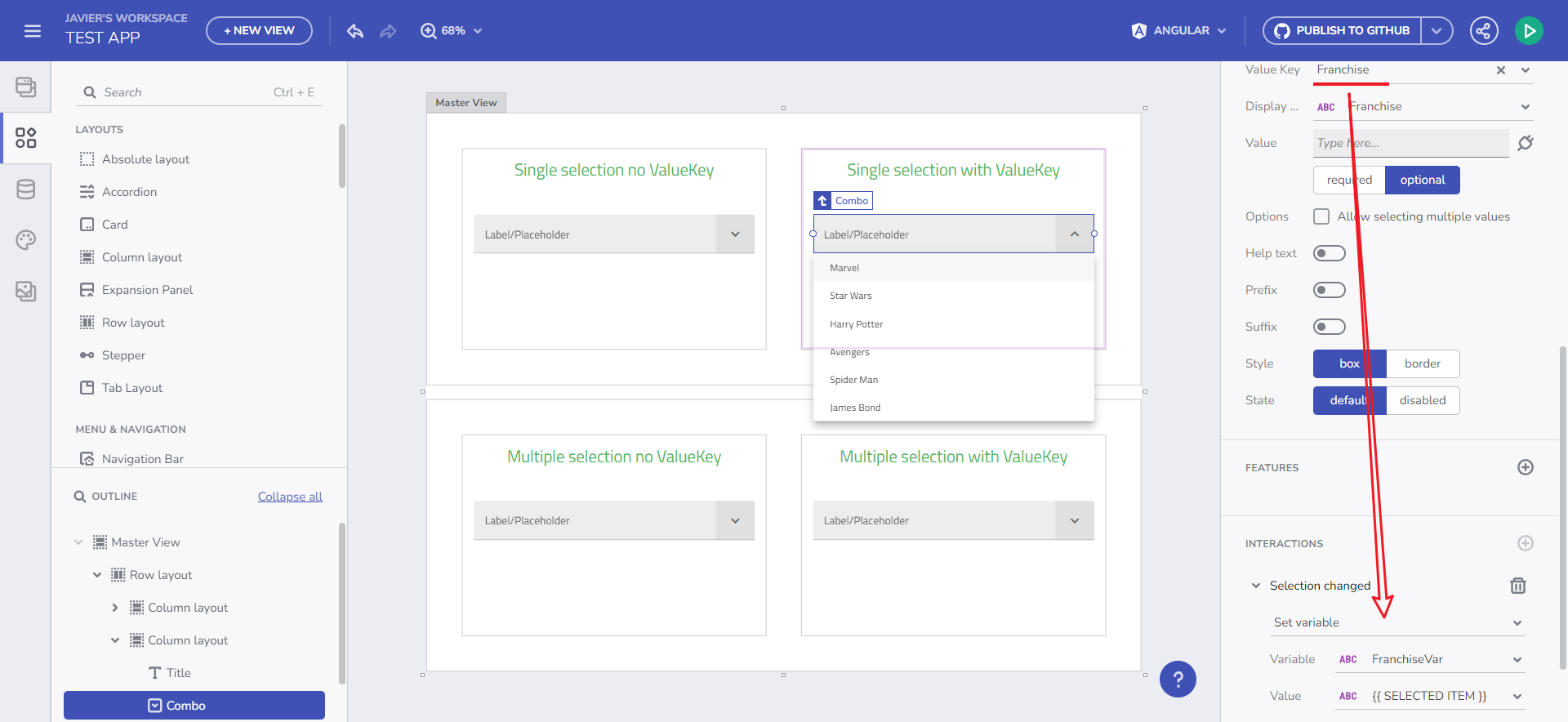 valueKey を使用した Combo コンポーネントの処理