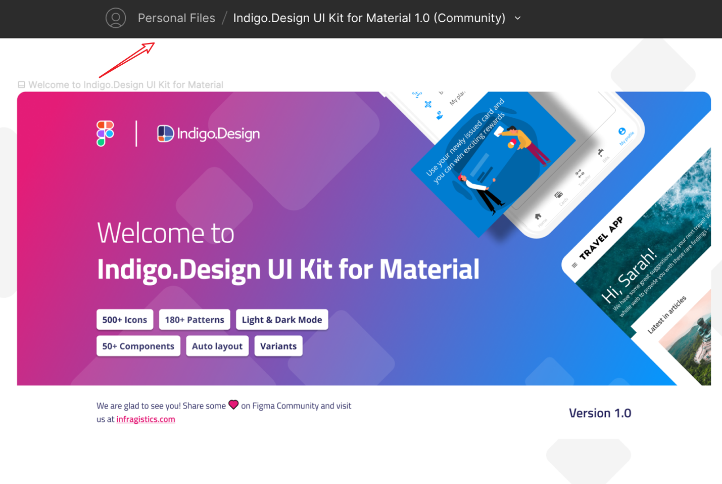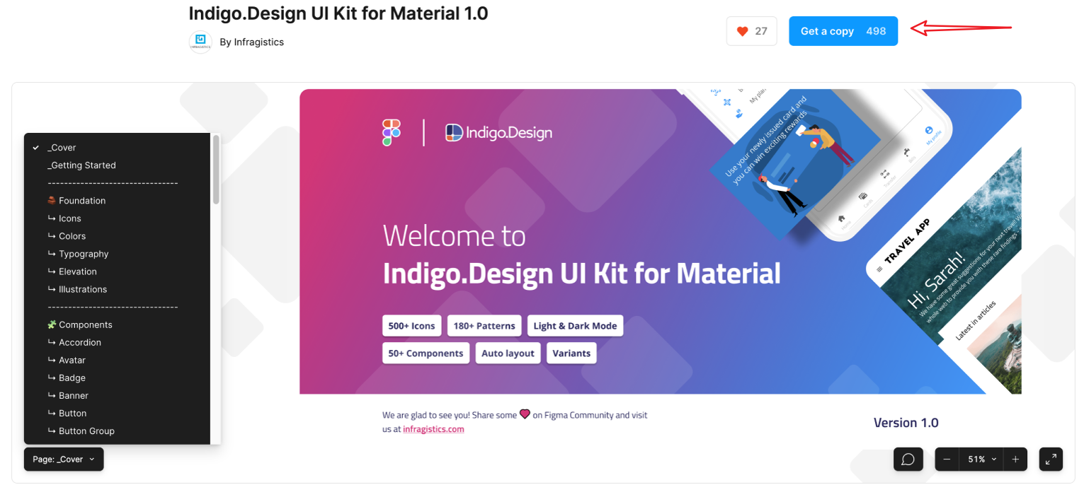 Figma プロフェッショナル アカウントのユーザーの場合、Indigo.Design UI Kit for Material を使用する方法は、Figma コミュニティから UI キットの複製を作成するだけです。ファイルを複製すると (Get a copy)、[Recent files] に配置されます。