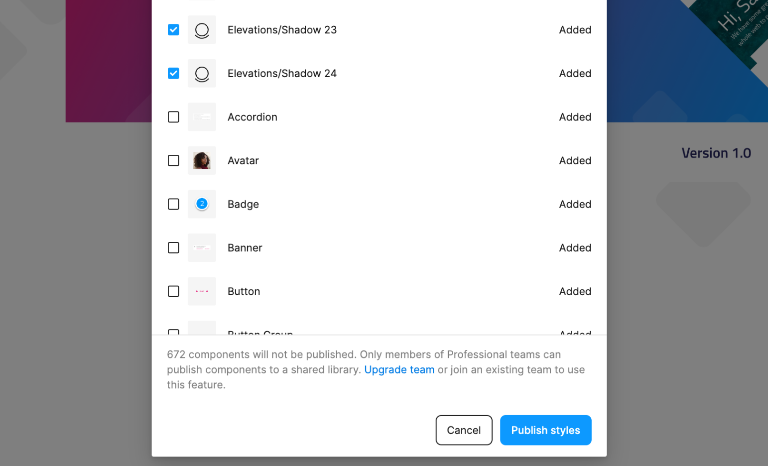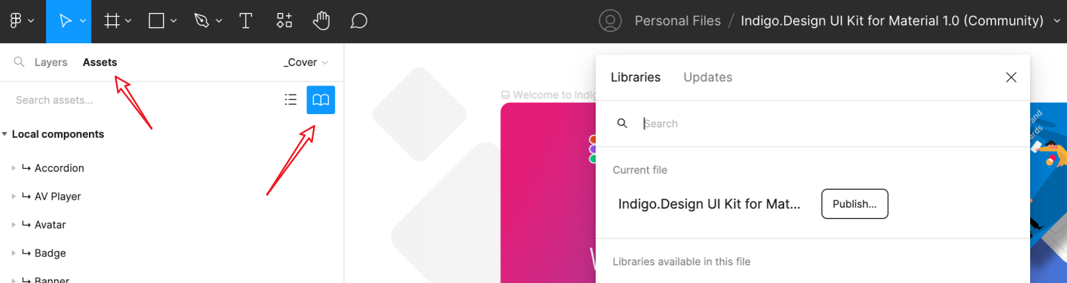 ファイルを移動したら、ファイルを開いて [アセット] パネルに移動します。チーム ライブラリ アイコンをクリックすると、このファイルをライブラリとして公開できるようになります。これにより、すべてのスタイル、タイポグラフィ、およびコンポーネントがチームの他のメンバーに配布されます。以降、プロジェクトを開始、またはチーム スペース内の既存のプロジェクトで作業を継続するときはいつでも、このライブラリをアクティブにして、プロジェクト内で直接使用することができます。