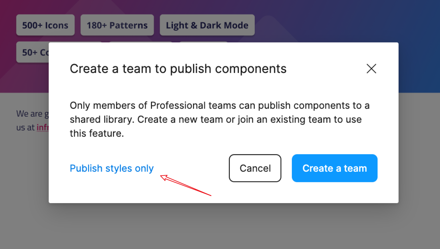 Figma スターターのユーザーの場合も、UI キットの使用方法はほぼ同じです。Figma コミュニティからファイルを複製したら、それを Recent files (最新のファイル) からチーム スペースに移動する必要があります。ファイルを開き、ファイル名のすぐ横にある下向き矢印を使用して、ファイルをチーム スペースに移動します。Figma スターター プランを使用すると、使用できるプロジェクトは最大 3 つまで、および、プロジェクトごとに 3 つのファイルしか含めることができないことに注意してください。ファイルを移動したら、次の手順でファイルを開き、[アセット] パネルに移動します。チーム ライブラリ アイコンをクリックすると、このファイルをライブラリとして公開できるようになります。これにより、カラー スタイルとタイポグラフィのみがチームの他のメンバーに配布されます。